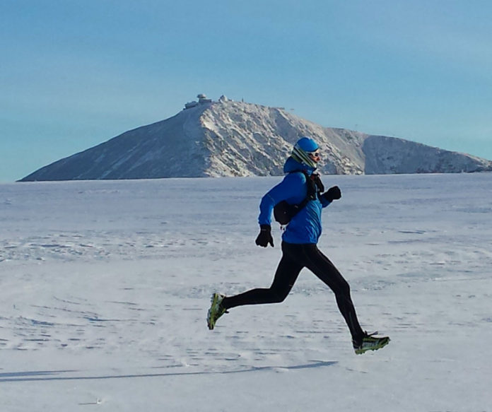Sobota przywitała nas słoneczkiem, zatem szybkie śniadanko rozgrzewka i niebawem staliśmy gotowi do biegu. Pierwsze dwa kilometry to wspinaczka na grań dalej odbijamy w kierunku Śnieżki. Pogoda idealna, buty wgryzają się w śnieg i lód.